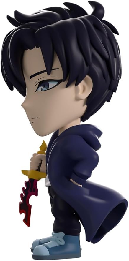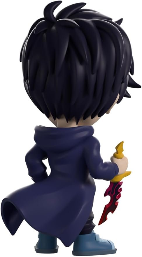 - Sung Jinwoo Vinyl Figure from Solo Leveling Webtoon – Features the Shadow Monarch from Solo Leveling, with a black cloak, blue hair, piercing blue eyes, and a Knight Killer dagger.